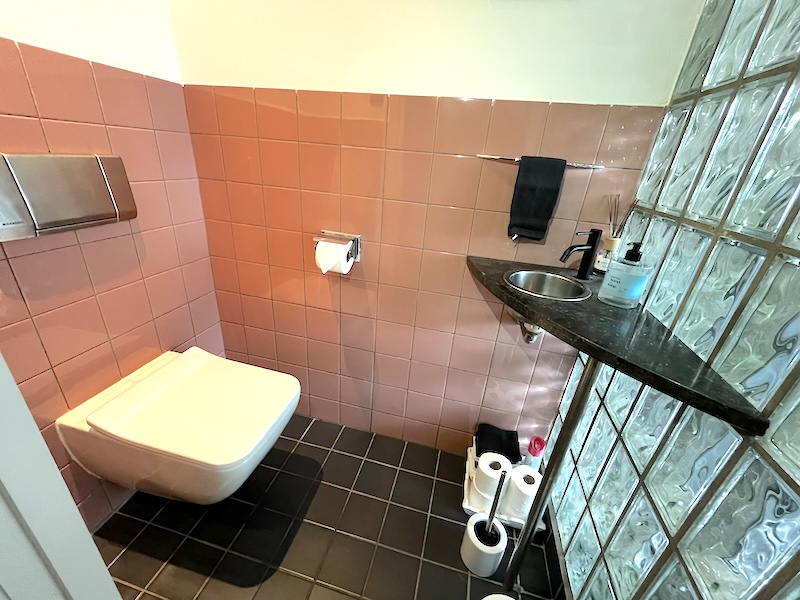 In de ruim opgezette badkamer vindt u een modern ingerichte douche, een brede wastafel met o.a. een föhn. Tevens staat hier een wasmachine en wasdroger met een comfortabel werkblad. Het toilet is apart van de badkamer.