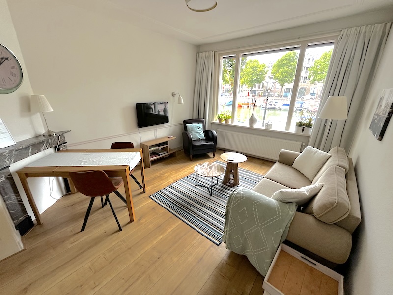 Geniet van de ruime, comfortabele woonkamer met uitzicht op de jachthaven, voorzien van interactieve TV. Er is tevens gratis WiFi, waarvan u gebruik kunt maken. Met de autovrije zone aan de voorzijde kunt u in alle rust genieten van het uitzicht op de haven en statige pakhuizen en herenhuizen aan de overkant.